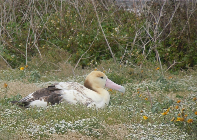 Full shot of an a short-tailed albatross resting on grass by Noah Kahn, USFWS