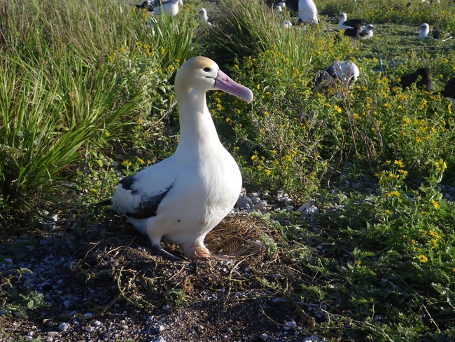 Full shot of an a short-tailed albatross standing on its nest by Noah Kahn, USFWS