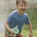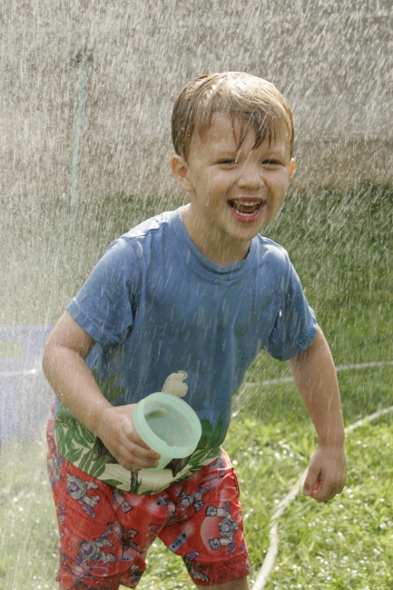 Young boy playing in a sprinkler