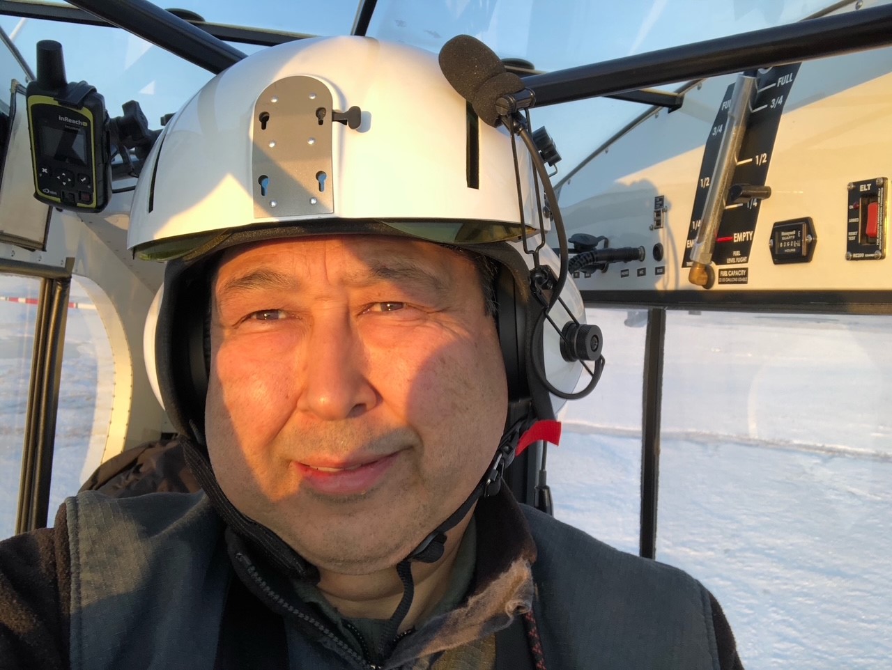Federal Wildlife Officer/ Airplane Pilot Robert Sundown taking in the view from his single engine tandem seat aircraft over a snow blanketed landscape. Courtesy of Nili Sundown.