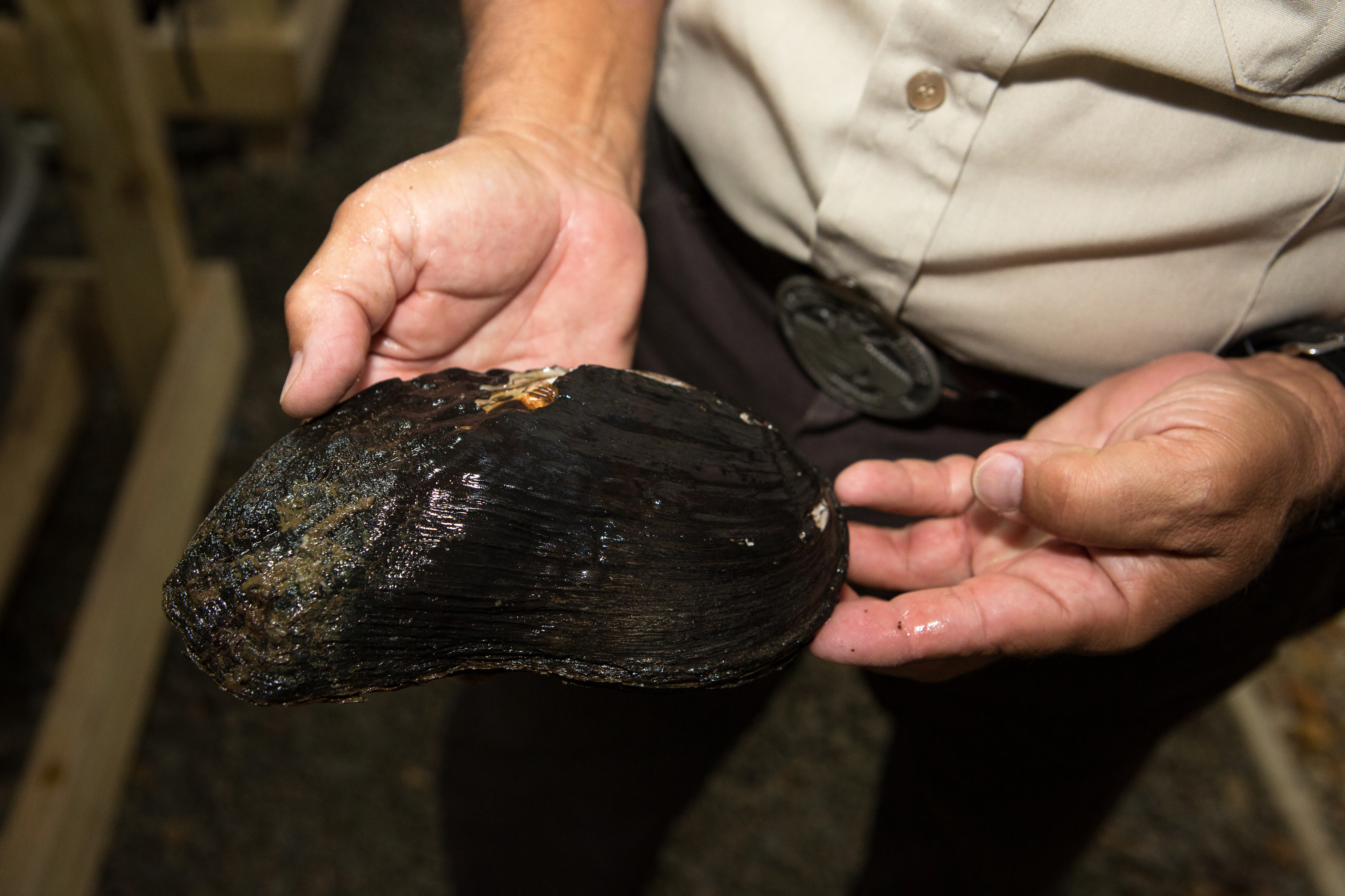 FWS biologist holds a purple bankclimber freshwater mussel. Endangered and/or threatened species.