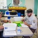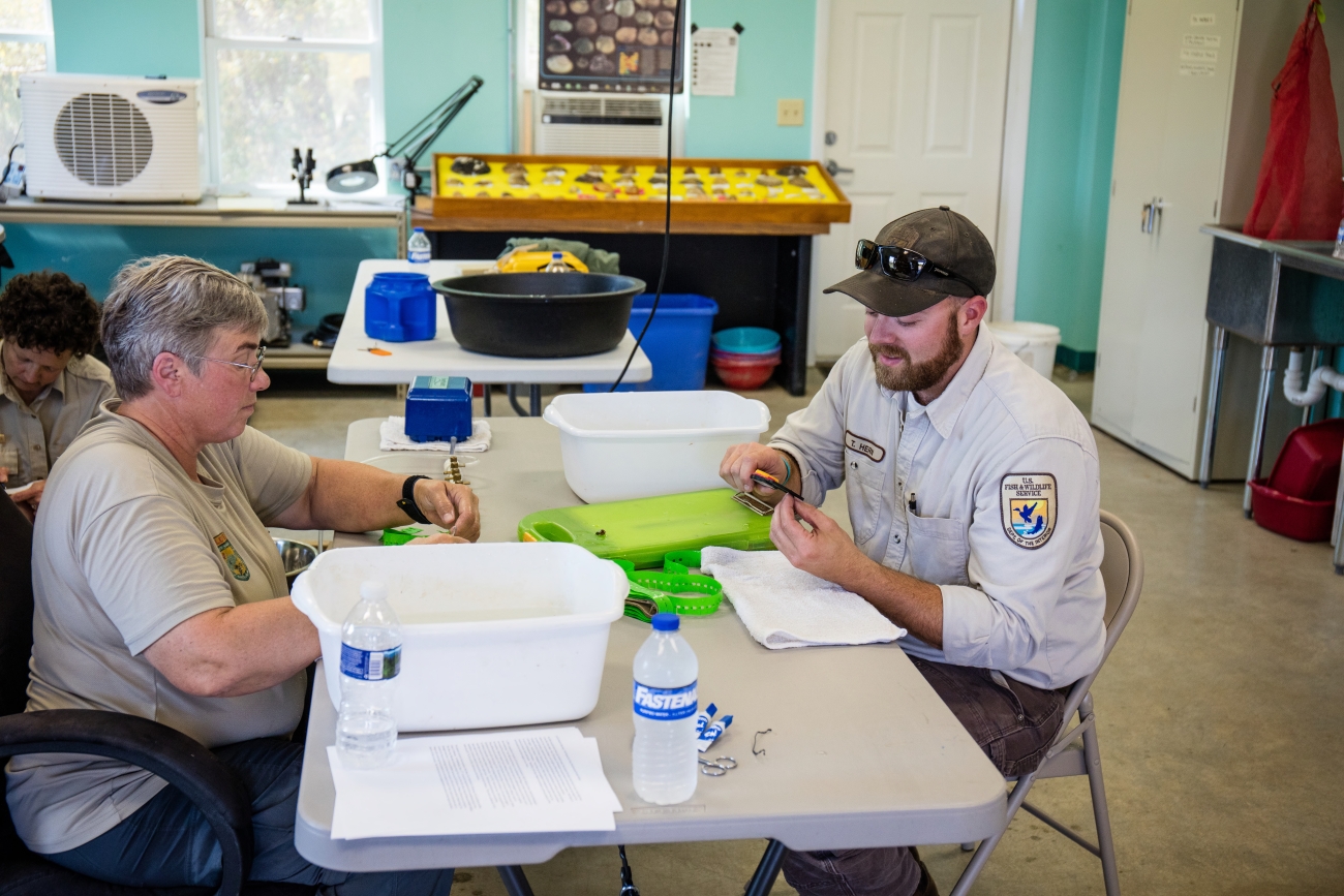 FWS biologist measures endangered Purple Cats's Paw mussel