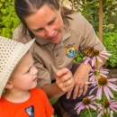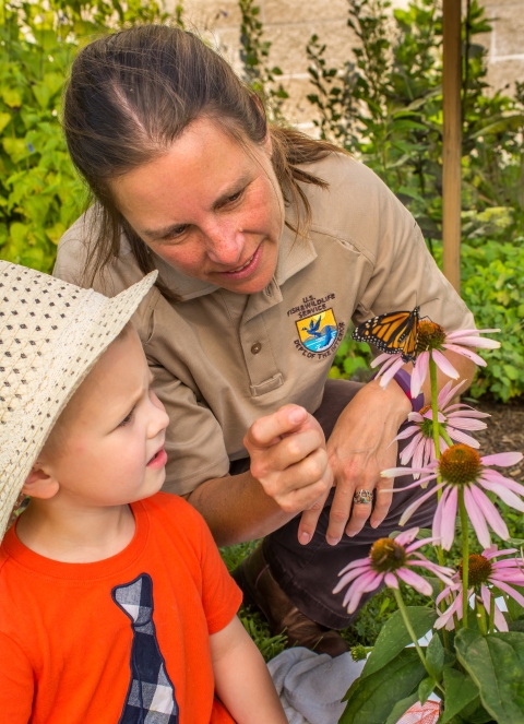 FWS employee and child looking at monarch on flower