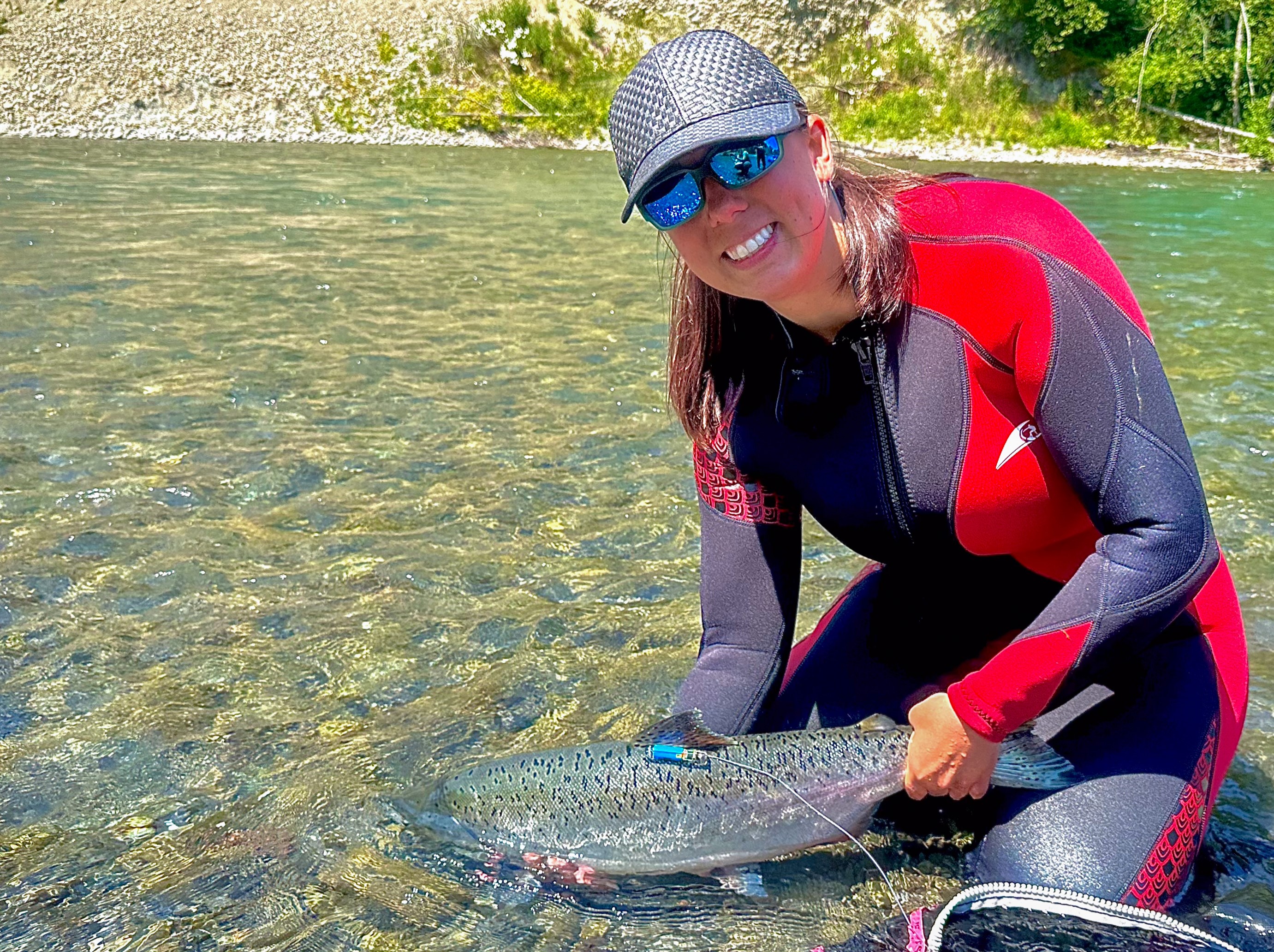 Tribal WaterCorps intern Bethany Fackrell holds a freshly tagged Chinook Salmon in the Elwha River just before releasing it.