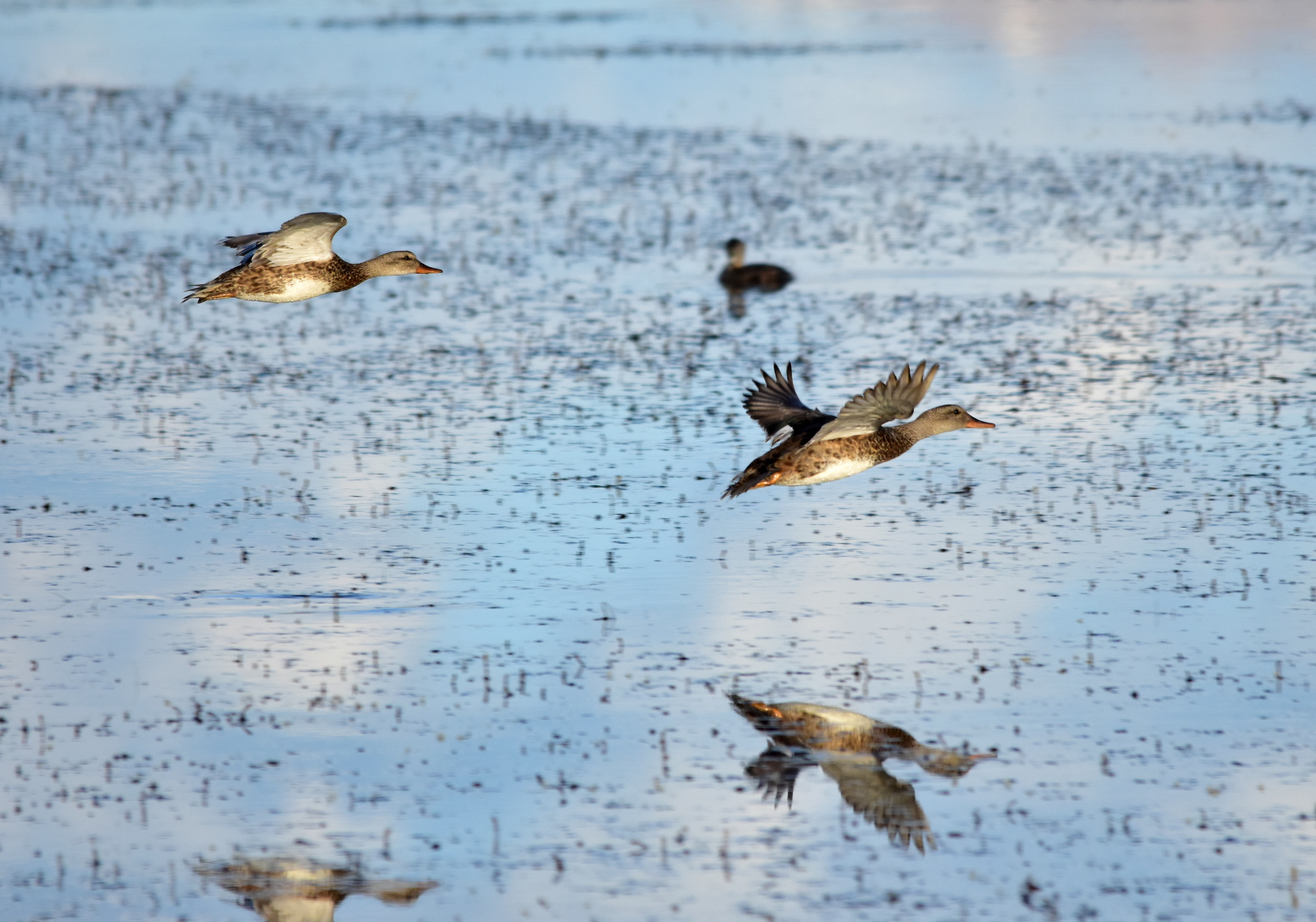 Morning reflection with Gadwalls in flight on Arapaho NWR.
