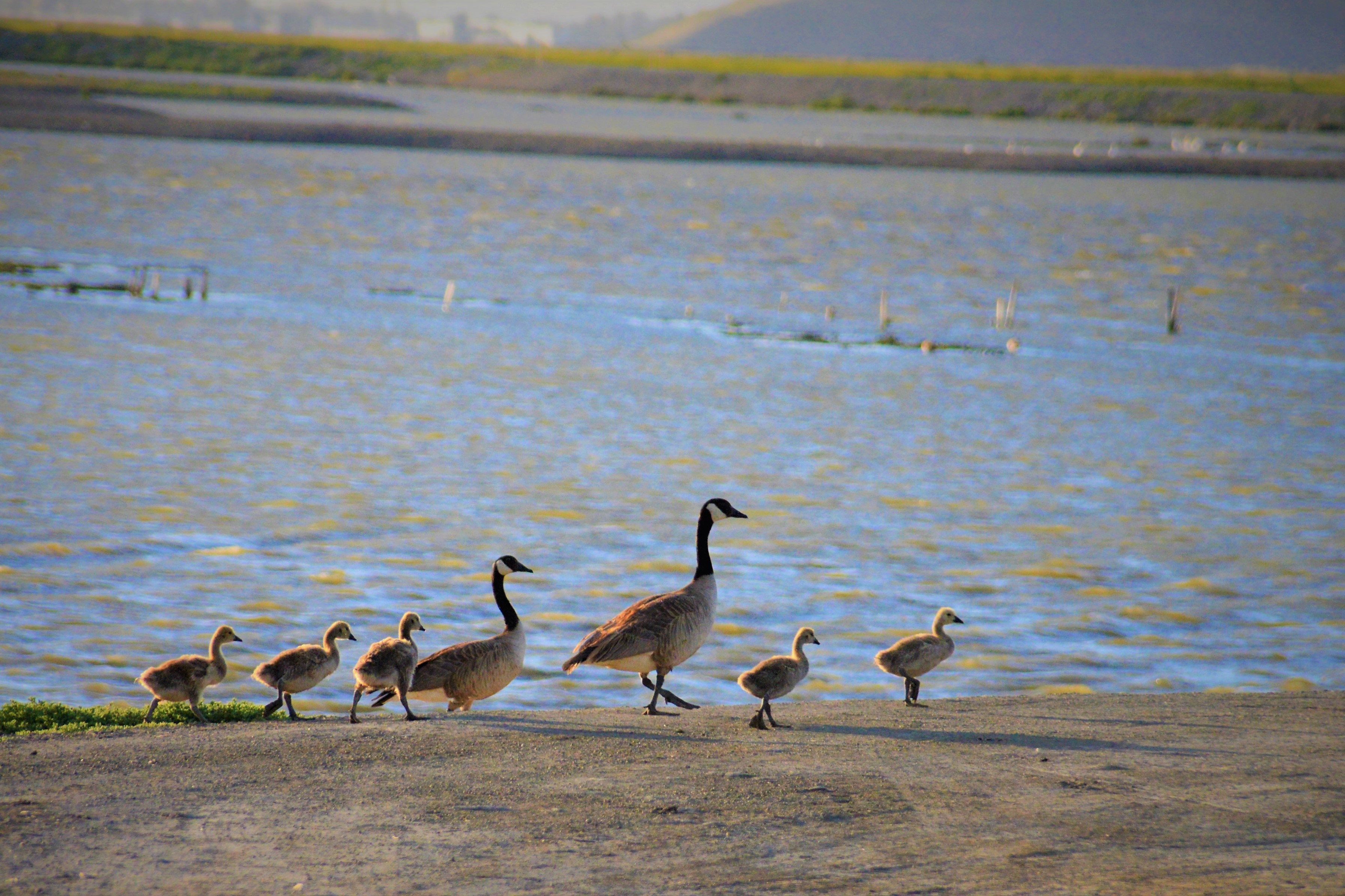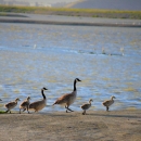Geese with goslings walking in a line along the shore