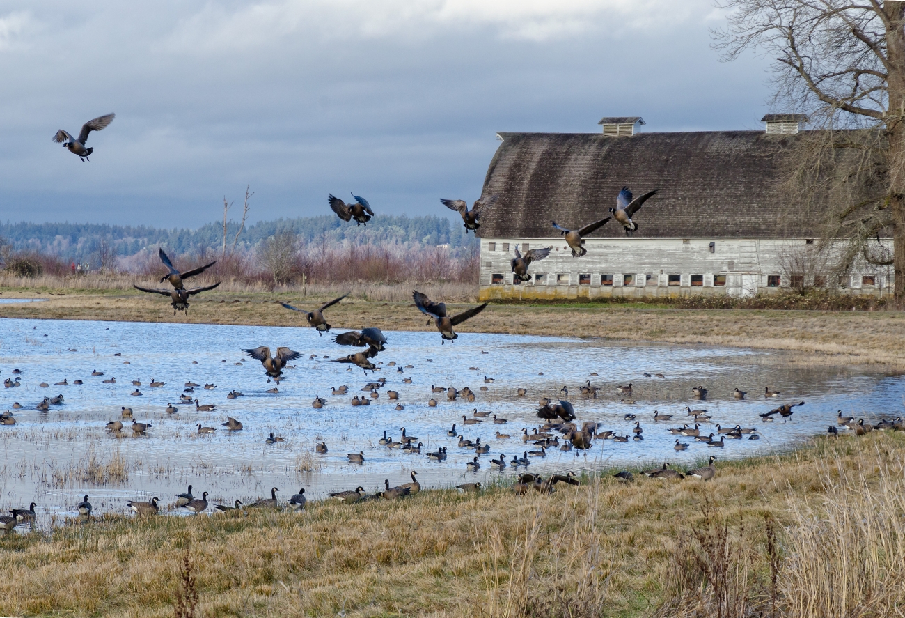 Geese land in a flooded field near an old barn