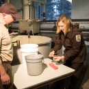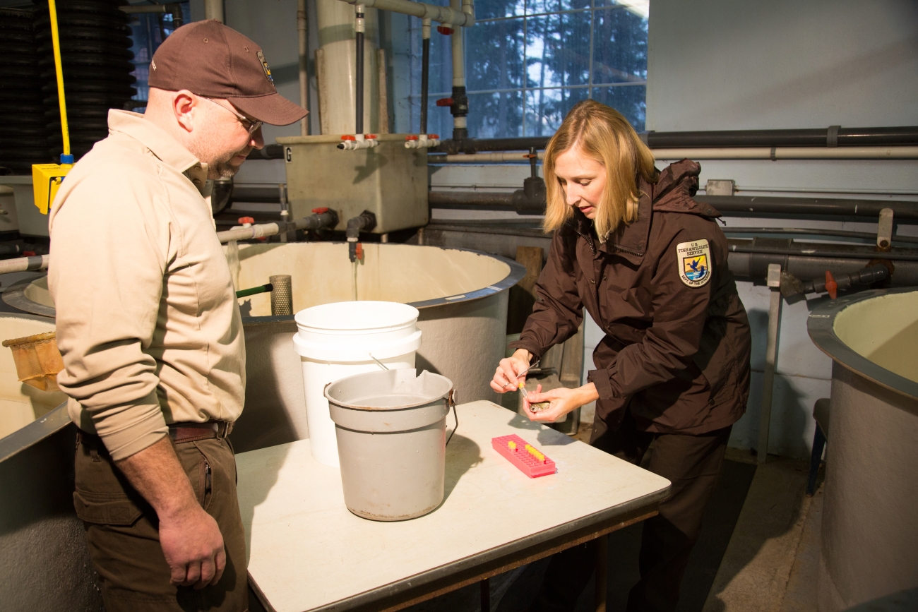 Geneticist collecting tissue from trout
