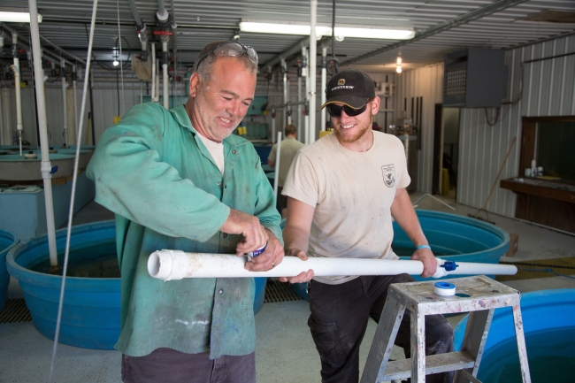 Genoa staff installs plumbing for new sturgeon tanks