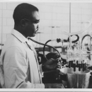 George Bagley, chemist, using a deep fry pot as a constant temperature bath for pesticide analysis.
