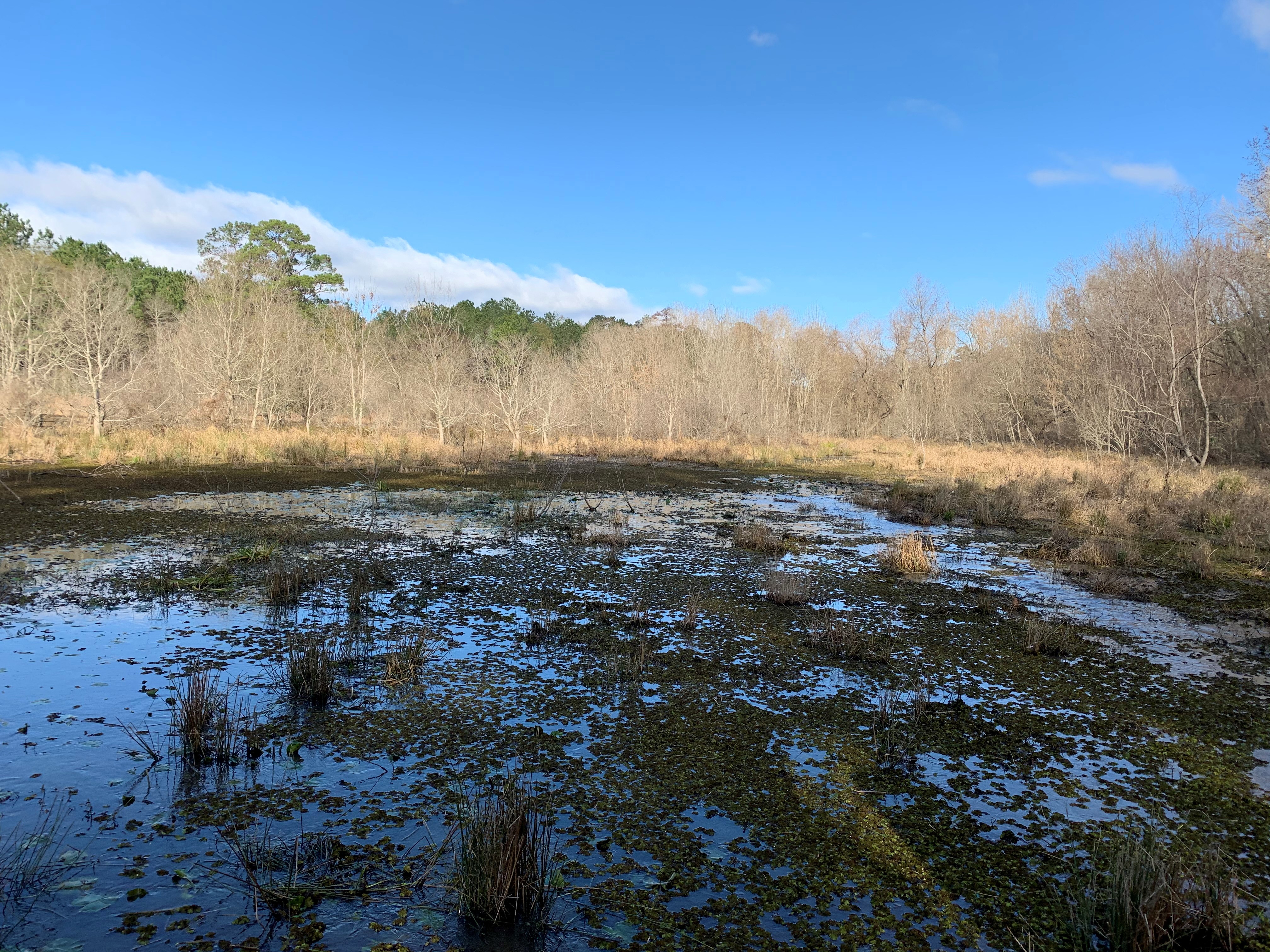 Giant salvinia covers the water in Lake Raven, located in Huntsville State Park, Texas.