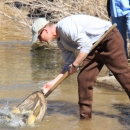 Arizona Game and Fish Department Fish Specialist Jason Kline releases native Gila trout into Frye Mesa Reservoir in the Pinaleno Mountains on Feb. 23, 2010. The project, funded by the American Recovery and Reinvestment Act, created the first Gila trout season in Arizona. Image taken from USFWS Southwest Region Flickr page.