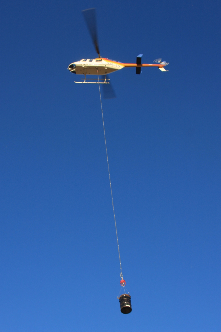 A Papillon helicopter carries a 55-gallon drum of native Gila trout up to Frye Creek on Feb. 23, 2011 in the Pinalenos Mountains of Arizona where the fish will be stocked. The project, funded by the American Recovery and Reinvestment Act, created the first Gila trout season in Arizona.
