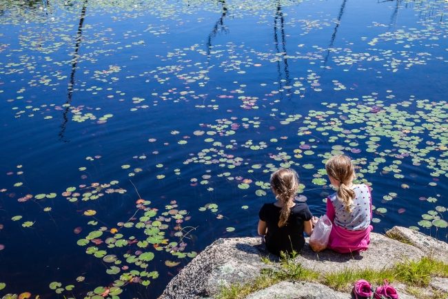Girls enjoying a frog pond in Mount Desert Island, Maine.