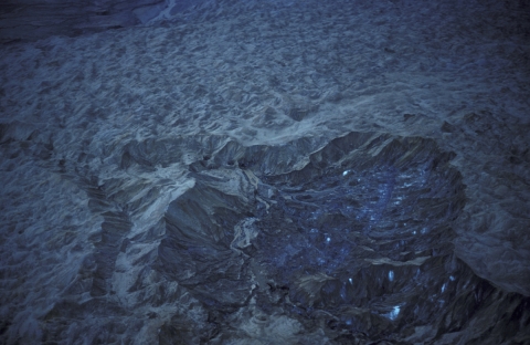 The zone of ablation occurs where summer loss of snow exceeds winter accumulation on a glacier surface. Aerial view of glacier.