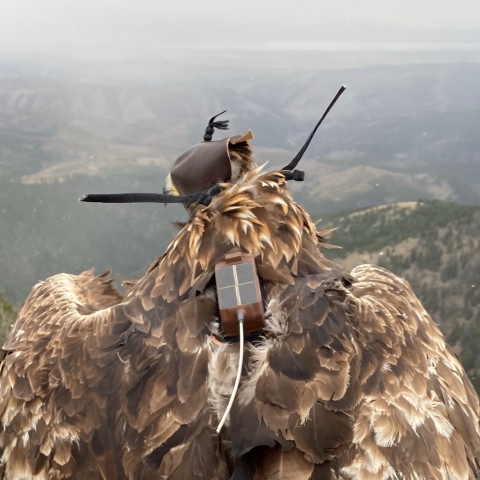 An adult golden eagle with a platform transmitter terminal used to study movement behaviors. Credit: Geoffrey Bedrosian, USFWS