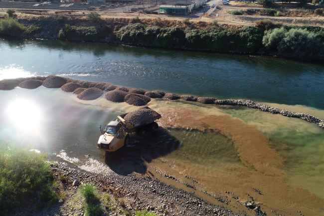 Gravel bar under construction to support native salmonids on the Lower American River.