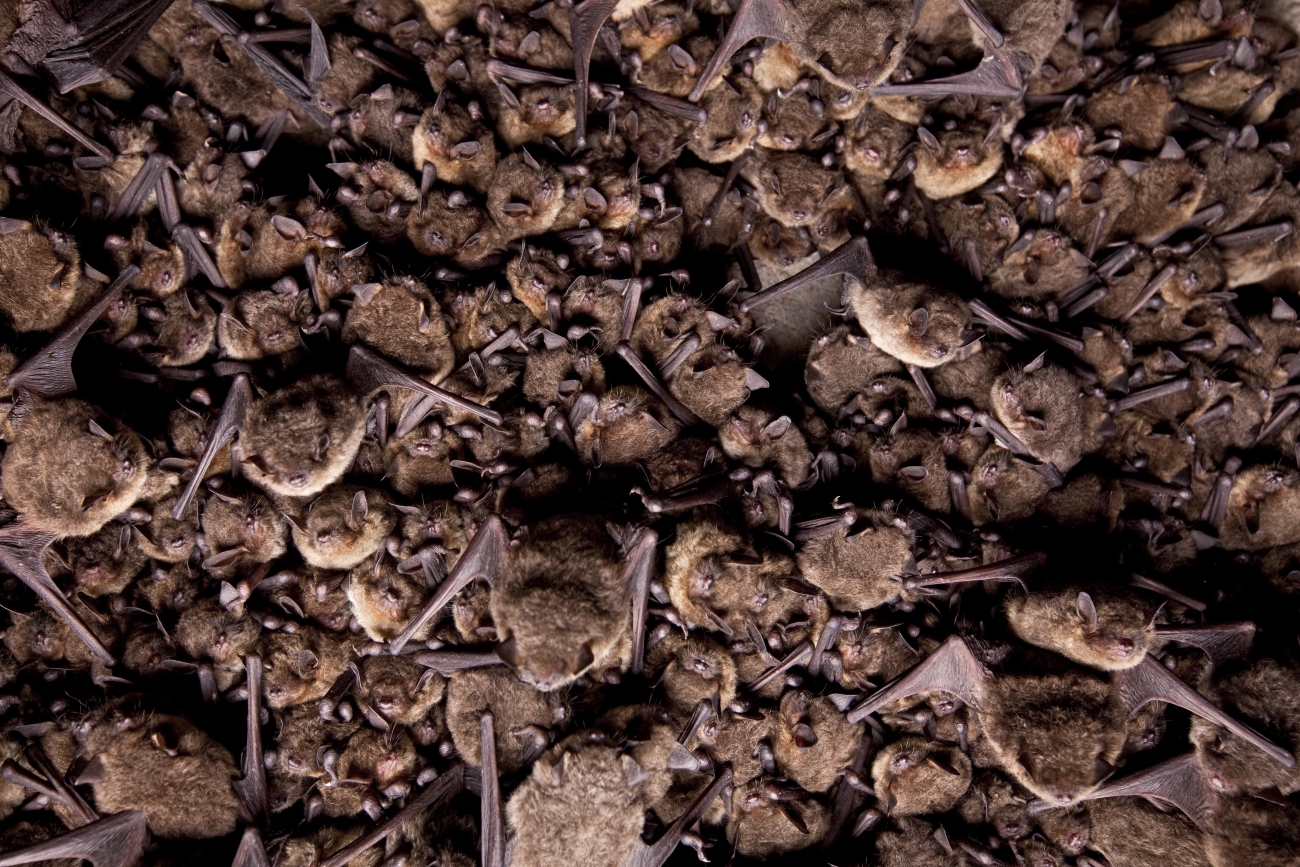 Gray bats in a huddle on the ceiling of a cave during an endangered grey bat census in Hubbard Cave, Tennessee. Hubbard cave is owned by The Nature Conservancy and is the winter home to 500,000 endangered grey bats.