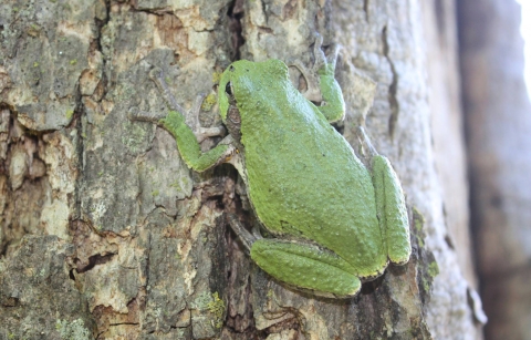 Gray tree frog spotted in the eastern part of the Morris Wetland Management Dist. In forested habitats and shallow wetlands. Large toe pads make them great climbers