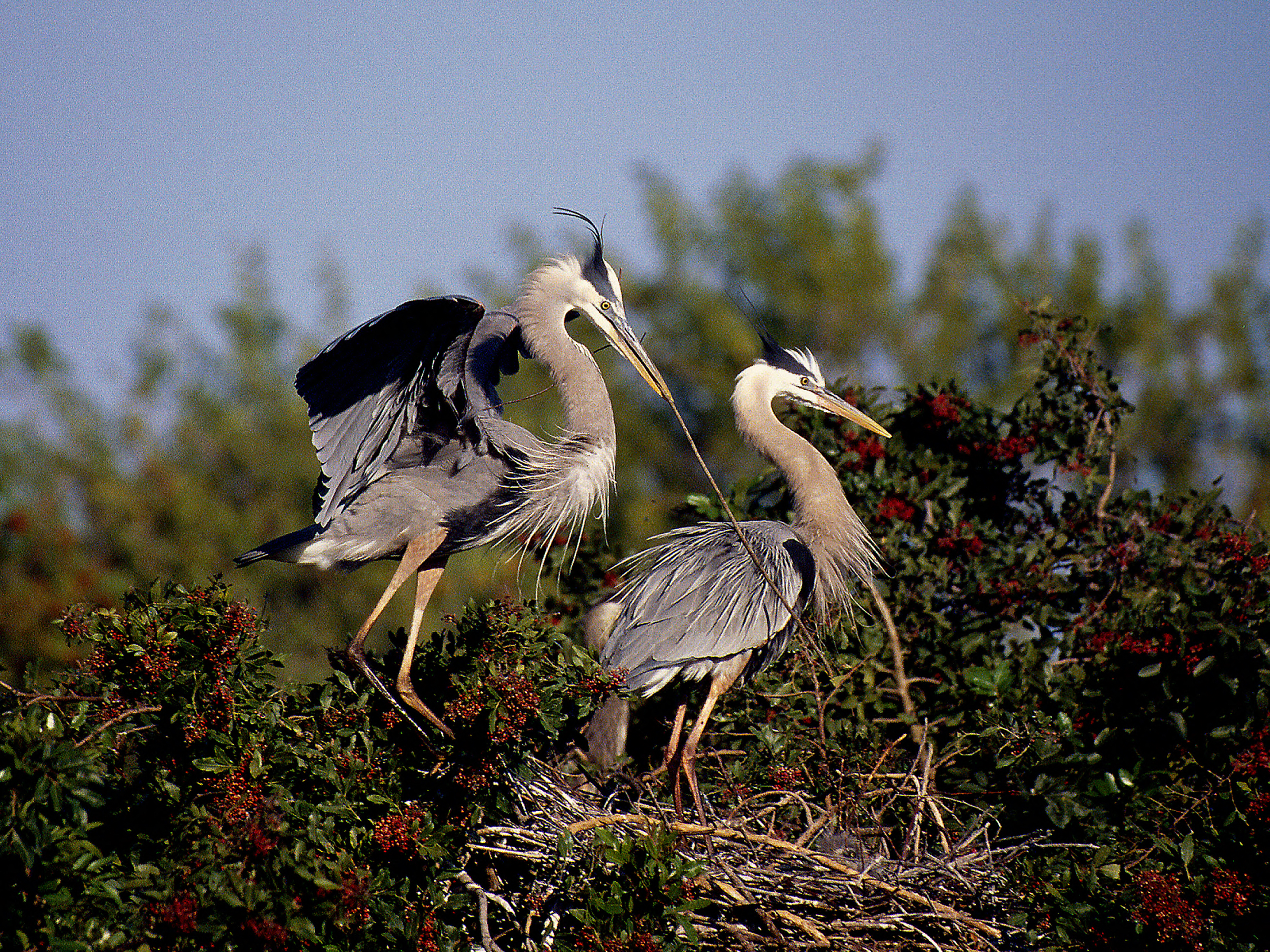 Largest of the North American herons with long legs, a sinuous neck, and thick, daggerlike bill. Head, chest, and wing plumes give a shaggy appearance.