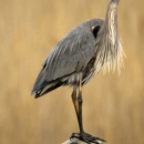 Great blue heron perches on nesting box in wetland area at Chincoteague National Wildlife Refuge.