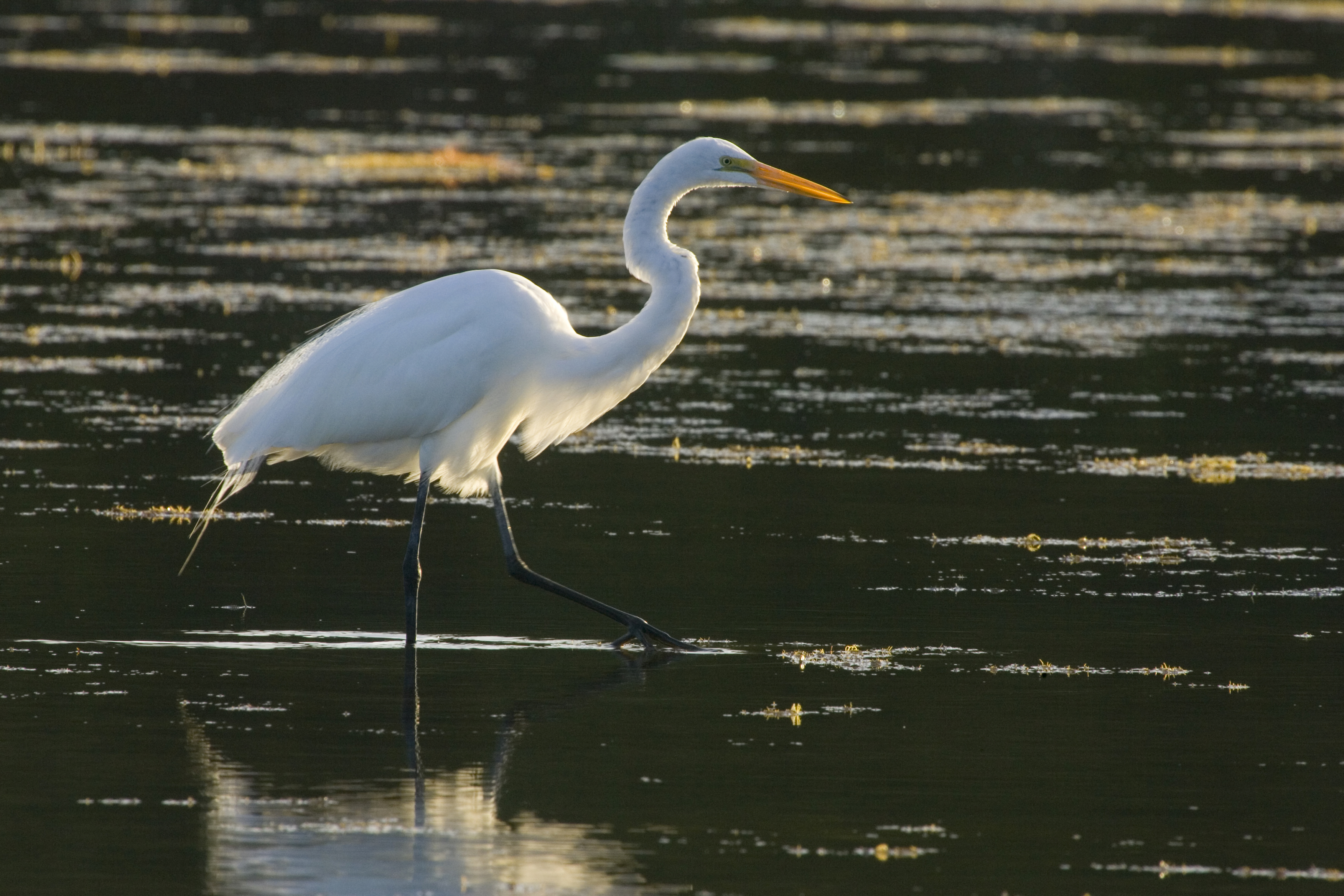 A Great egret strolls through the water in search of food.