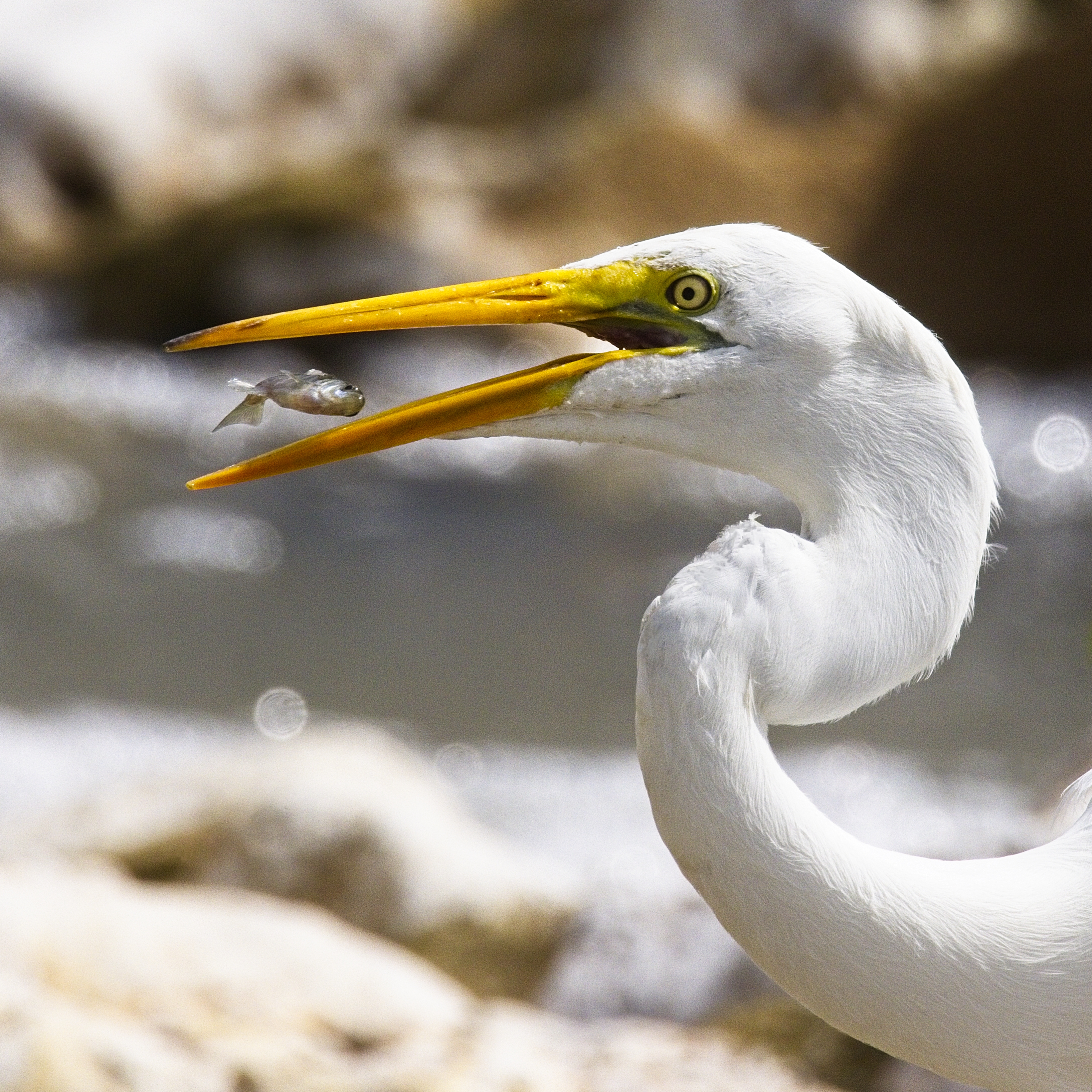 Great Egret with fish in mouth at Confluence Park, San Antonio