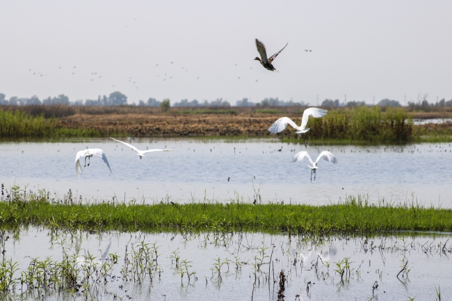 Great egrets fly over the Sacramento National Wildlife Refuge Complex near Willows, Calif. “Each cog in the wheel is important for the waterfowl. Mutual goals lead to high-quality waterfowl viewing and hunting opportunities,” said Michael Derrico, supervisory wildlife biologist with the Service. Photo by John Heil, USFWS.