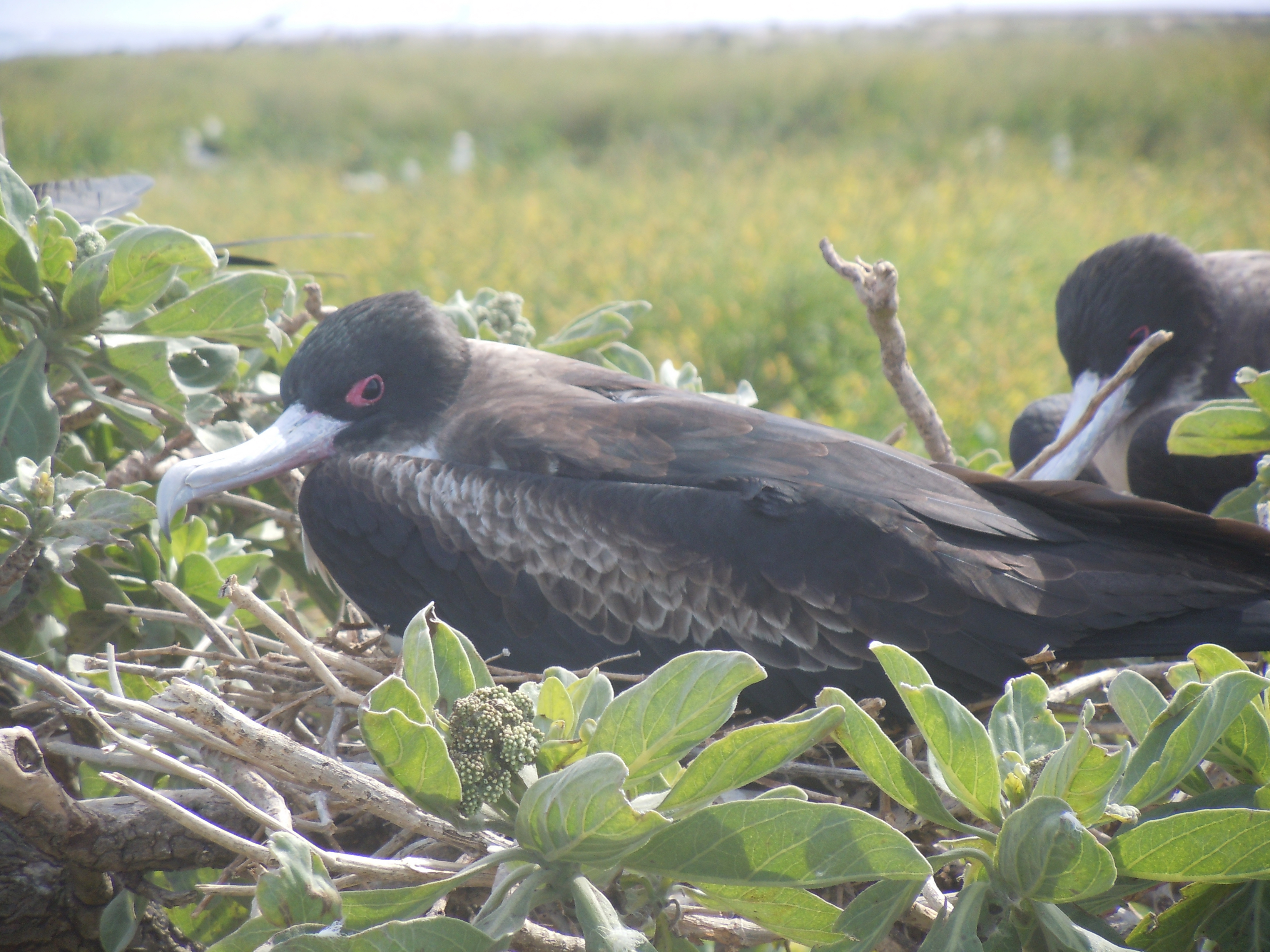 A large bird, with long, slender wings, deeply forked, tail and long, pale blue/grey to blackish hooked bill. Adults have mostly black plumage. Adult males have a red inflatable throat pouch.