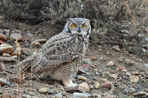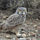 A Great Horned Owl is perched on the transition from sage steppe to riparian habitats at Seedskadee NWR. Great horned owls are common in the river valley and their calls can be heard up and down the river on calm nights. They are a significant predator on Seedskadee NWR and there are very few things they will not eat. Great horned owls have the most diverse diet of all North American raptors. They eat mostly mammals and birds at Seedskadee NWR , especially cottontail rabbits, white-tailed jackrabbits, meadow voles, mice, and American Coots. They also kill and eat many other species including least chipmunks, white-tailed prairie dogs, bats, feral house cats, ducks, mergansers, grebes, rails, other owls, hawks, crows, ravens, doves, and starlings. They are one of the few to kill porcupines and striped skunks. They supplement their diet with reptiles, insects, fish, invertebrates, and sometimes carrion. They are primarily nocturnal hunters and use their excellent hearing and night vision to locate prey. They will occassionally hunt in broad daylight, but run the risk of other raptors harrassing them severely. We have spotted both prairie falcons and Northern harriers taking turns driving great horned owls out of their territory. www.allaboutbirds.org/guide/Great_Horned_Owl/lifehistory