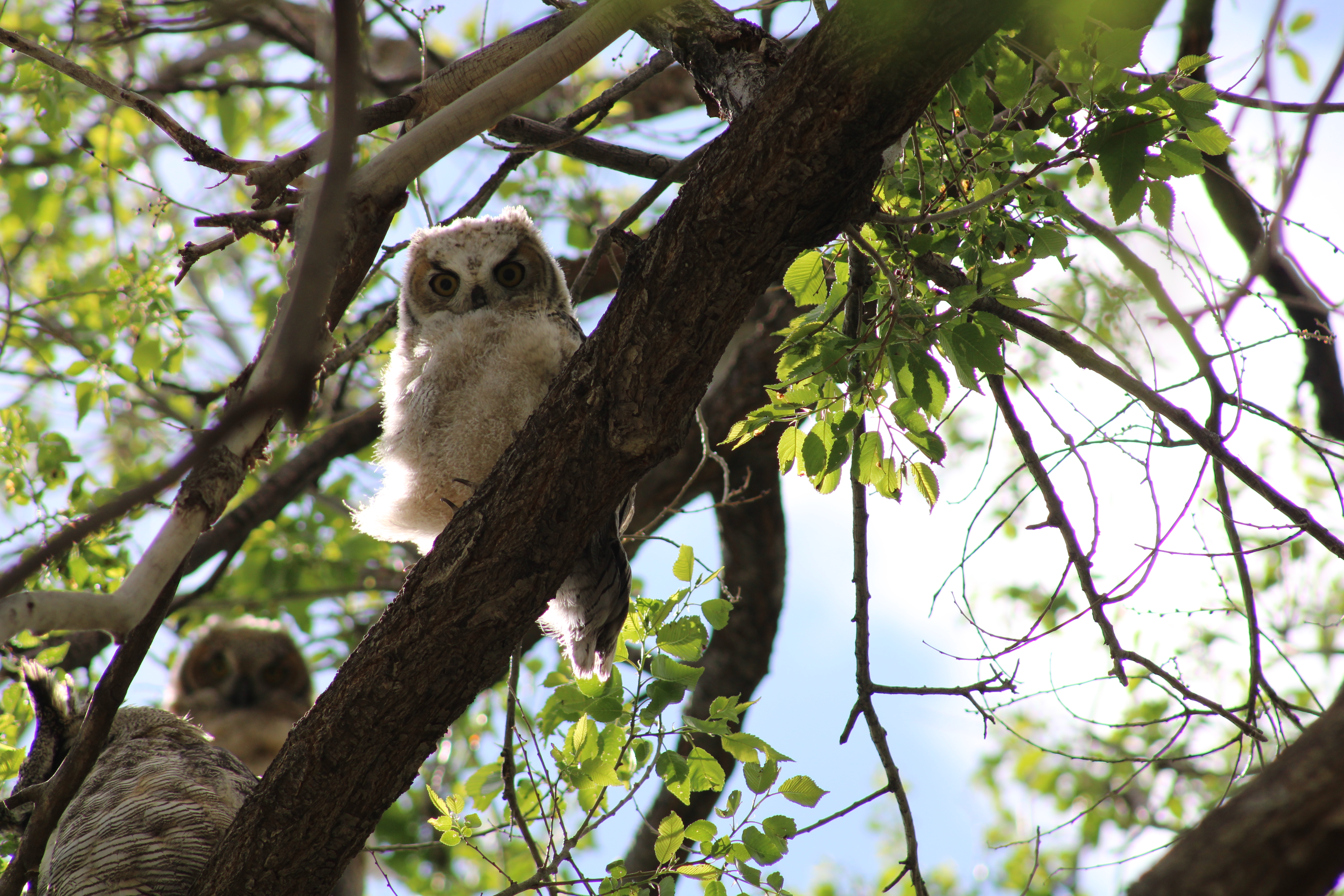 Great horned owl chick at perched on branch at Maxwell National Wildlife Refuge