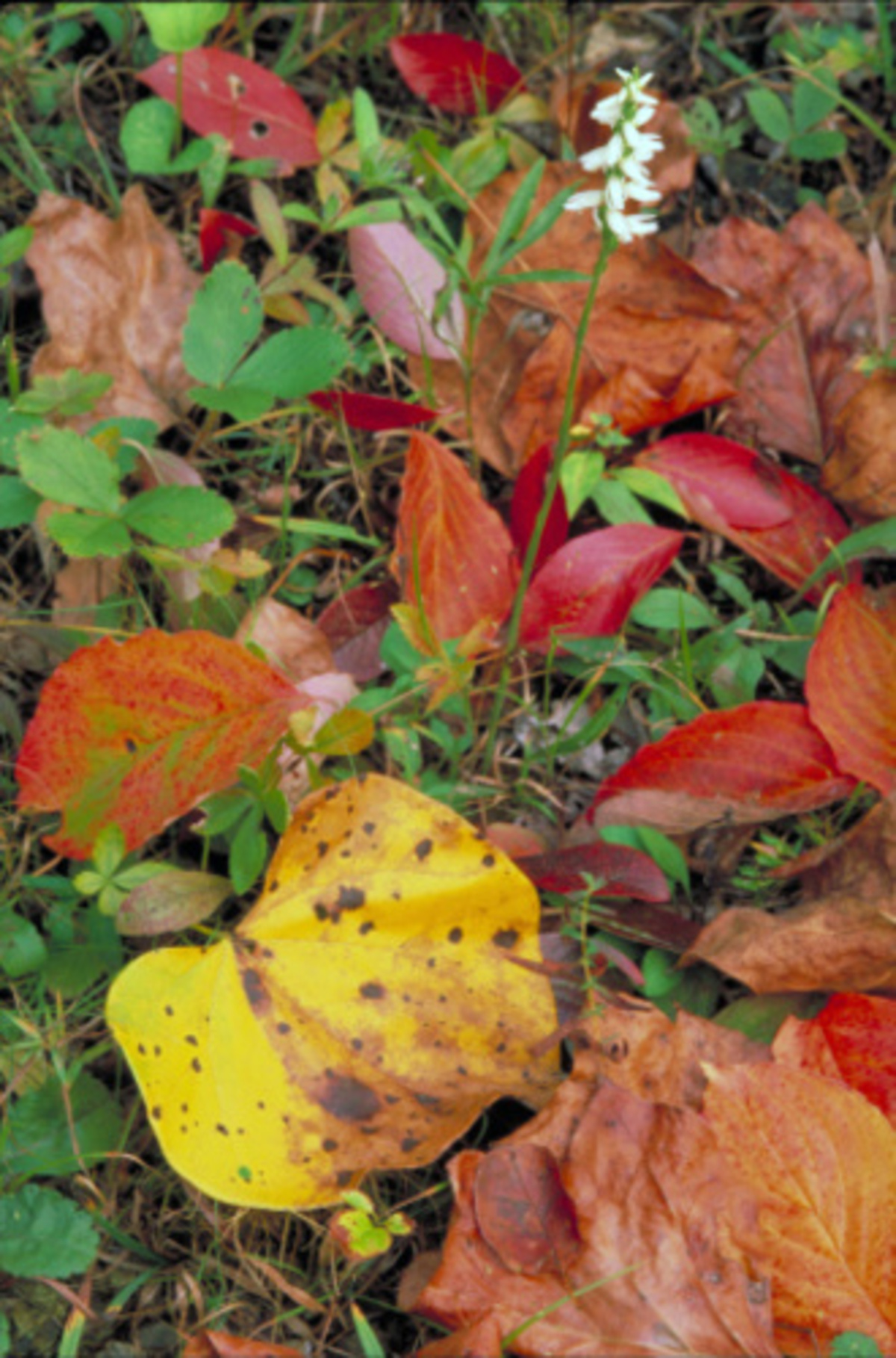 Stem with small white orchid blossoms rising from autumn leaves. For additional resources about wildflowers visit the National Plants Database http://plants.usda.gov/.