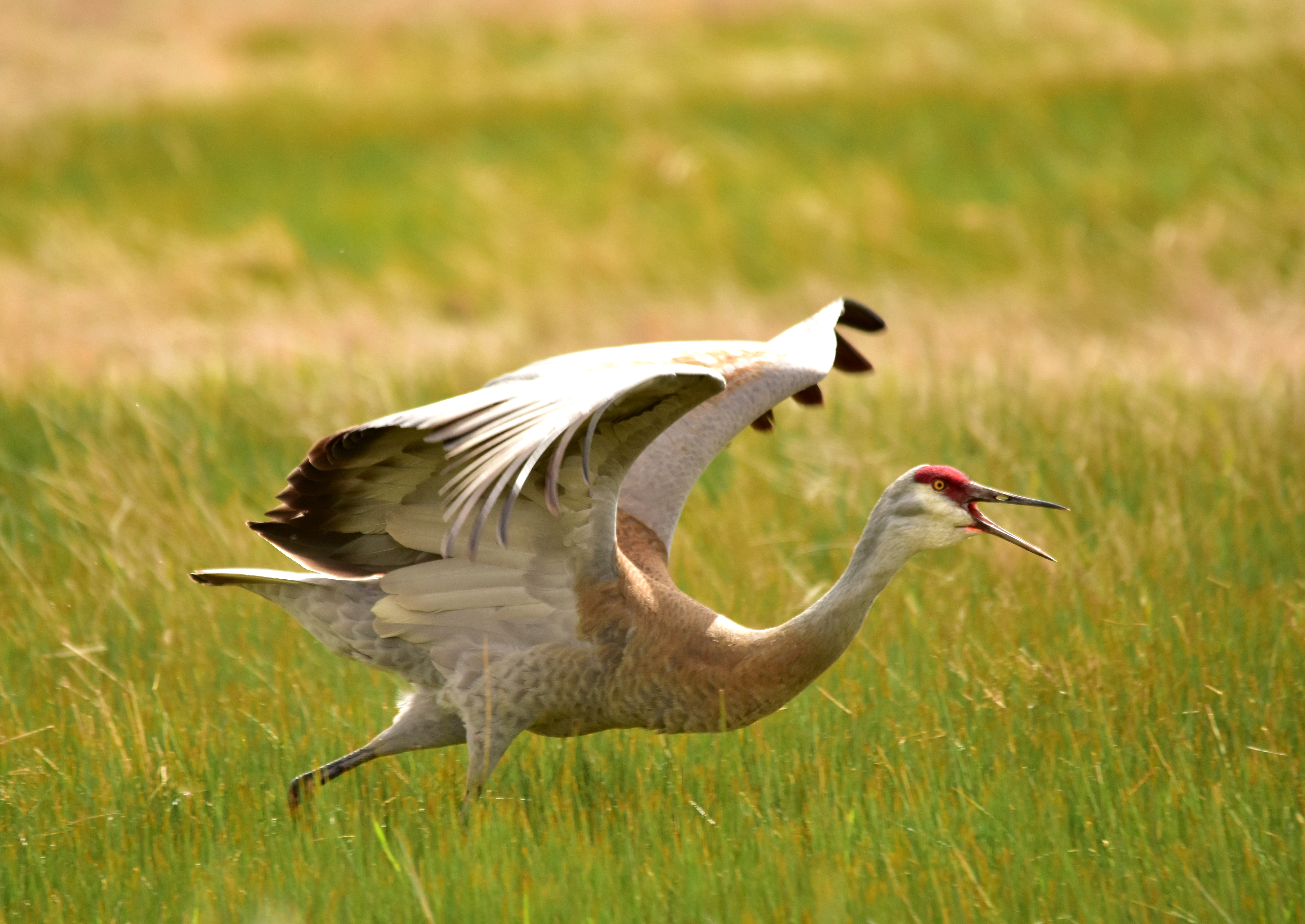 A greater sandhill crane reacts to the approach of a bald eagle. The bald eagle is closing in on a sandhill crane colt (juvenile) hidden nearby.