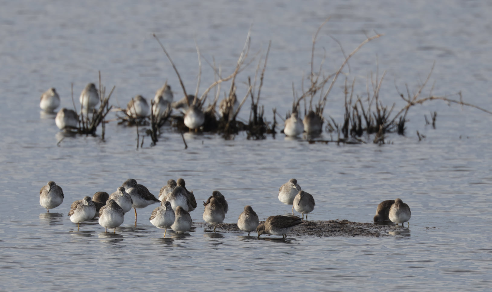 Greater yellowlegs gather to rest in the shallow waters of West Pool.