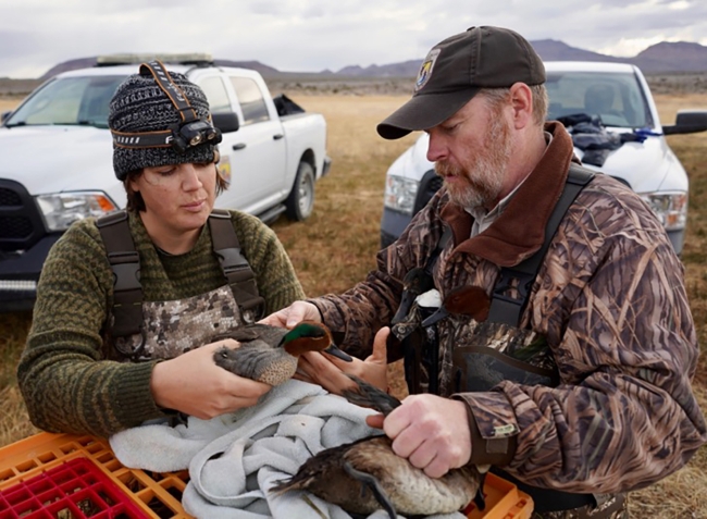U.S. Fish and Wildlife Service Refuge Specialist Becky Lausch (left) and Pahranagat National Wildlife Refuge Manager Rob Vinson assess the health of a green-winged teal they are about to band during 2022 waterfowl banding operations on the Nevada wildlife refuge.