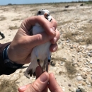 Caption: Amid a backdrop of sand and stone beach, a pair of hands is carefully holding a piping plover and its feet so that its color bands are visible for documentation.