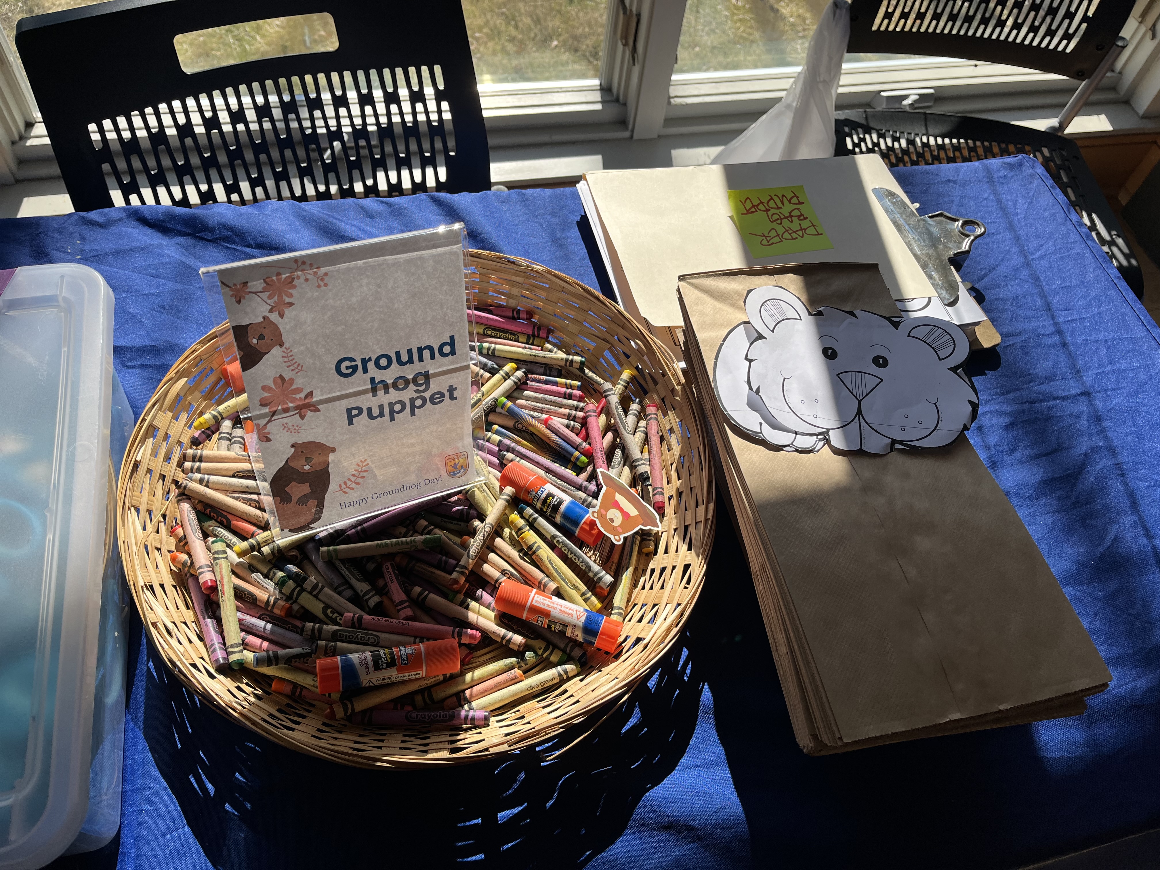 A station for people to create their own groundhog puppet using a brown paper bag at John Heinz National Wildlife Refuge at Tinicum's Groundhog Day Celebration.