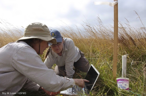 Laura Brophy (left) of Greenpoint Consulting and masters candidate student Megan MacClullan (right) download data from a groundwater well. Fourteen wells are located within the restoration area and four are in the control (natural) marsh to monitoring changes in ground water depth and temperature over time. Image taken from USFWS Pacific Region Flickr page.