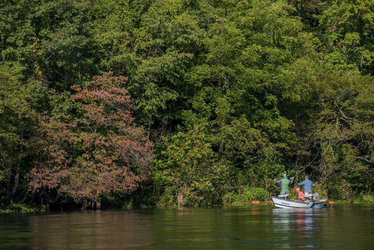 Group fishing in drift boat on White River