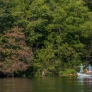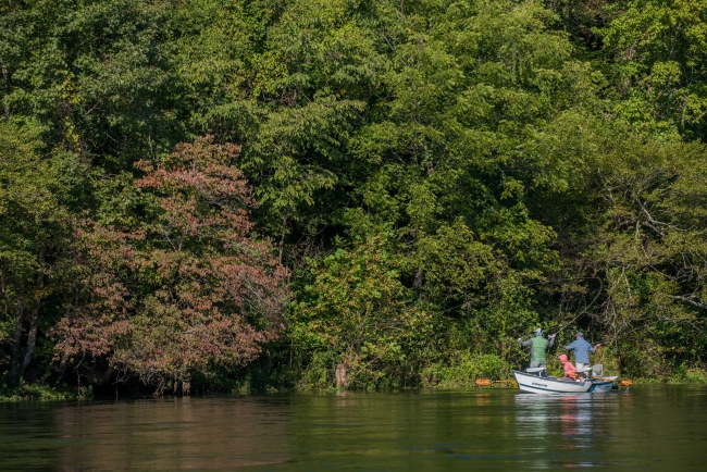 Group fishing in drift boat on White River, Arkansas.