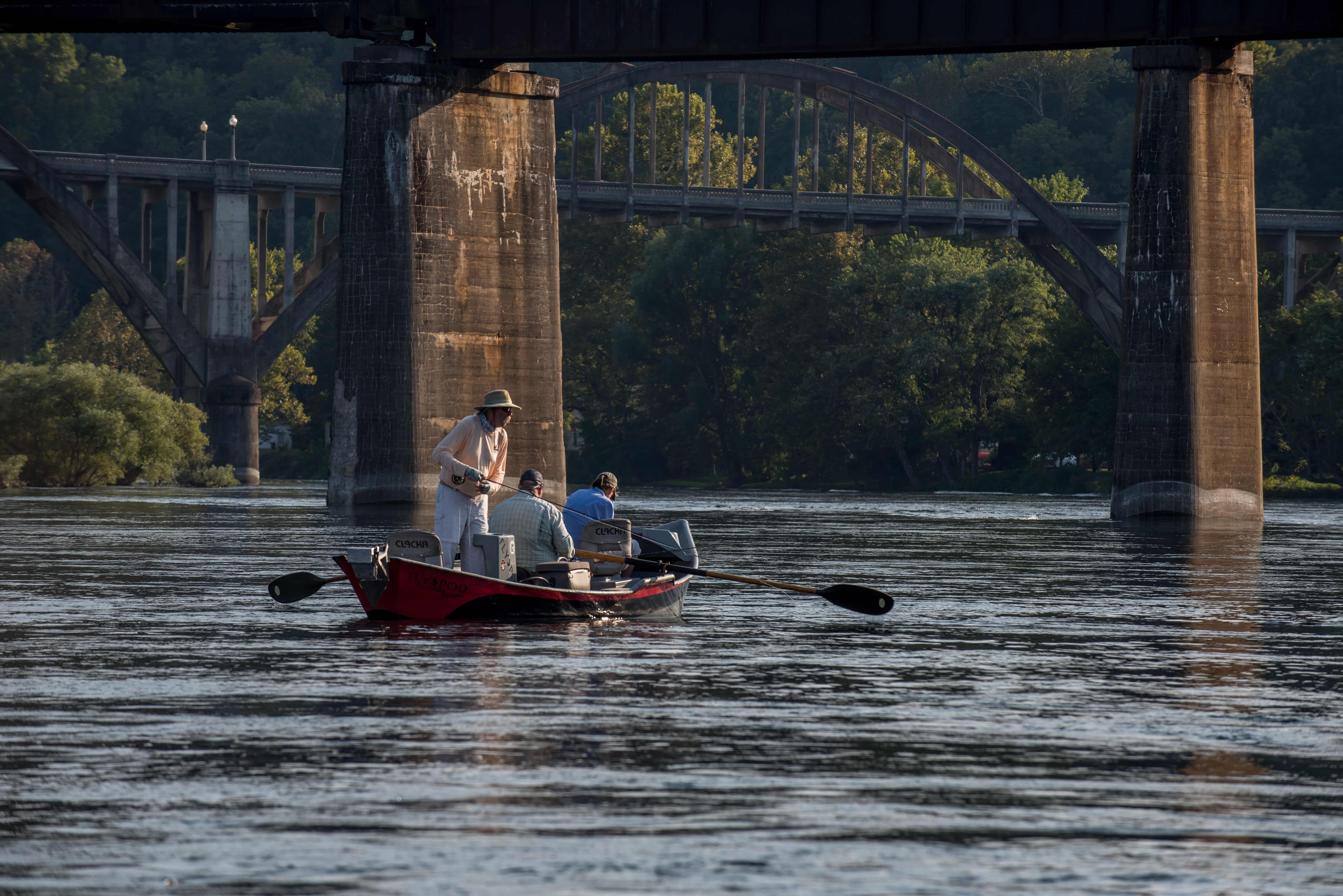 Group fly fishing from drift boat on White River, Arkansas, near bridge.
