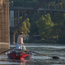 Group fly fishing from drift boat on White River, Arkansas, near bridge.