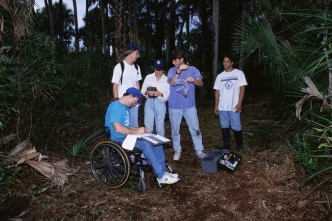 Fish and Wildlife Service biologist showing Fish and Wildlife Service volunteers a Pygmy rattlesnake; five people are in the volunteer group, one person in a wheelchair.