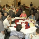 Small groups working at tables during the Conservation in Action Summit held at the National Conservation Training Center.
