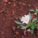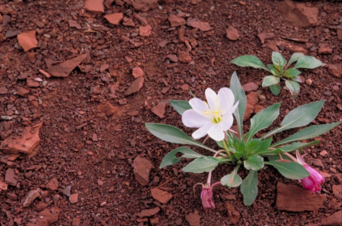 An image of a white flower among red rock. Western North Dakota is the easternmost limit of the range of the beautiful gumbo lily. The plant occurs in nearly all of our western states. This short, tufted plant is a nearly stemless perennial from a thick taproot. Leaves are about 6 inches long, lance-shaped, and toothed. Flowers, when young, are white, but soon age to a rose or lavender color. These flowers, which may be over 3 inches wide, give the plant an ungainly appearance. Young plants may have one or two flowers and a dozen leaves, but older plants may have a heavy rootcrown bearing a dozen flowers and nearly a hundred leaves. Rough seedpods about an inch long form soon after flowering. Gumbo lily, sometimes called "butte primrose," likes the bare clay buttes, arroyos, and claypans found in our western badlands and grasslands. Cattle seem to avoid gumbo lily; nevertheless, the plant never becomes overly abundant. References indicate that young shoots and roots of some Oenotheras are eaten by humans, but I could find no mention of any economic uses for gumbo lily. This is not a true lily, but a member of the evening primrose family (Onagraceae). Flowers in this family generally open in late afternoon or evening for pollination by night-flying insects. The names Onagra and Oenothera stem from a name used by the Greek intellectual Theophrastos (370-285 B.C.) for the fireweeds that are also members of this family. The specific epithet caespitosa means "tufted" in botanical Latin. Gumbo lily was first collected for science by the eminent English botanist Thomas Nuttall (1786-1859). Nuttall visited the Mandan villages in what now is North Dakota in 1811.