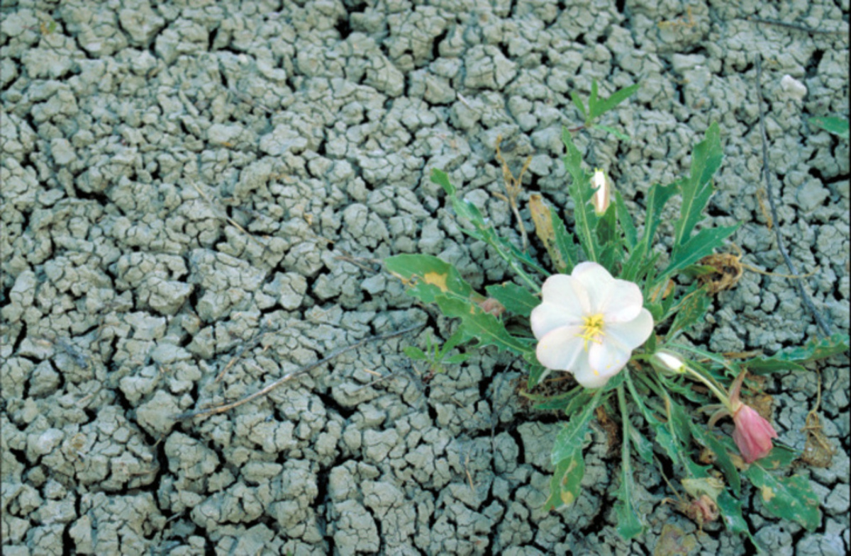 A white flower among gray rocks.An image of a white flower among red rock. Western North Dakota is the easternmost limit of the range of the beautiful gumbo lily. The plant occurs in nearly all of our western states. This short, tufted plant is a nearly stemless perennial from a thick taproot. Leaves are about 6 inches long, lance-shaped, and toothed. Flowers, when young, are white, but soon age to a rose or lavender color. These flowers, which may be over 3 inches wide, give the plant an ungainly appearance. Young plants may have one or two flowers and a dozen leaves, but older plants may have a heavy rootcrown bearing a dozen flowers and nearly a hundred leaves. Rough seedpods about an inch long form soon after flowering. Gumbo lily, sometimes called "butte primrose," likes the bare clay buttes, arroyos, and claypans found in our western badlands and grasslands. Cattle seem to avoid gumbo lily; nevertheless, the plant never becomes overly abundant. References indicate that young shoots and roots of some Oenotheras are eaten by humans, but I could find no mention of any economic uses for gumbo lily. This is not a true lily, but a member of the evening primrose family (Onagraceae). Flowers in this family generally open in late afternoon or evening for pollination by night-flying insects. The names Onagra and Oenothera stem from a name used by the Greek intellectual Theophrastos (370-285 B.C.) for the fireweeds that are also members of this family. The specific epithet caespitosa means "tufted" in botanical Latin. Gumbo lily was first collected for science by the eminent English botanist Thomas Nuttall (1786-1859). Nuttall visited the Mandan villages in what now is North Dakota in 1811.