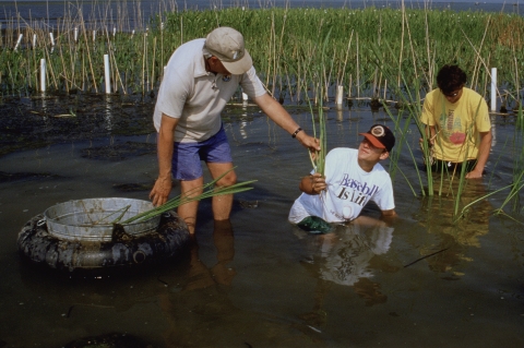 A group of volunteers work together on a habitat restoration project in the Mobile Bay area of Alabama.