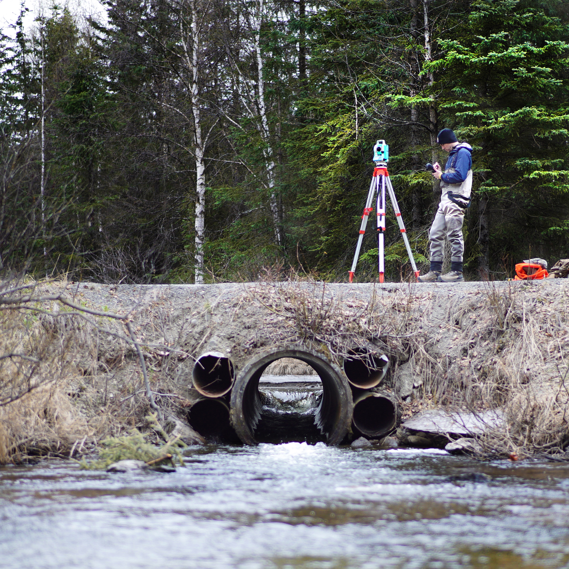 U.S. Fish & Wildlife Service hydrologist Franklin Dekker survey a DOT access road cross a salmon stream in Anchorage, Alaska. The information will be used to design a crossing that doesn't hinder salmon movement. Photo: USFWS/Katrina Liebich