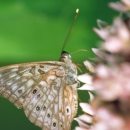 Butterfly with tan wings dusted with white and a few dark spots, standing on blooms, viewed from side with wings closed.