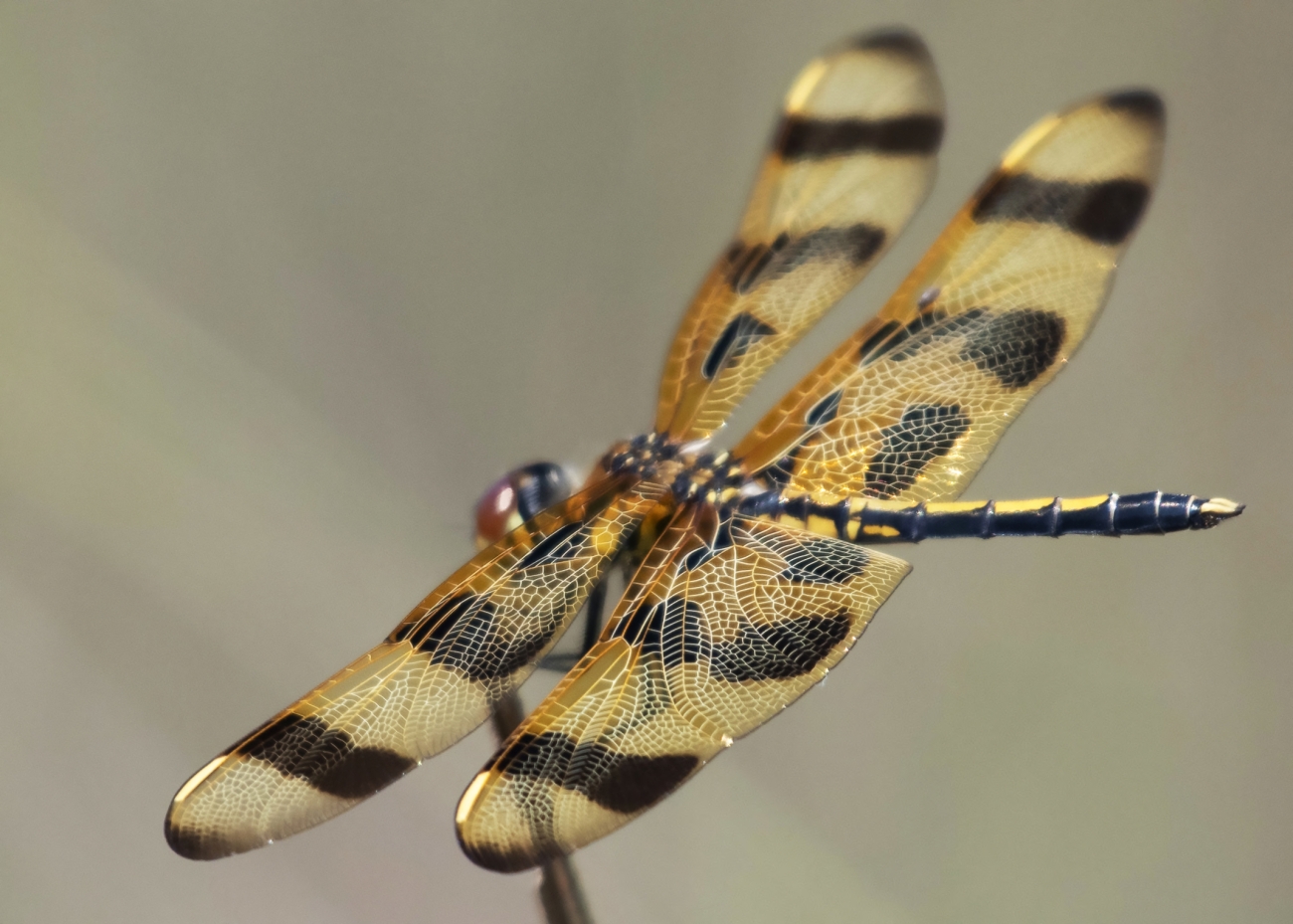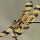 The Halloween pennant dragonfly is a brightly colored dragonfly found in the eastern United States. The Halloween pennant gets its name from its orange colored wings, which have dark brown bands marking them.